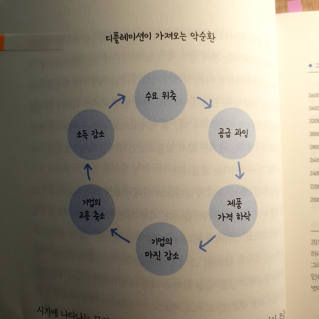 수요 위축 -> 공급 과잉 -> 제품 가격하락 -> 기업의 마진 감소 -> 기업의 고용 축소 -> 소득 감소 -> 소비 위축